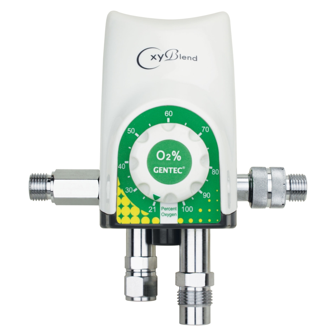 GENTEC® Medical Air-Oxygen Blender is a medical device used to mix Medical Grade Air and Oxygen to a concentration ranging from 21% -100% oxygen. The inlet gas connections are standard DISS or NIST. The inlets are clearly marked and labeled on the bottom of the Blender. The outlets are standard DISS male oxygen connections. A concentration adjustment knob is located on the front panel of the Blender to set the specific FIO2 blend desired.